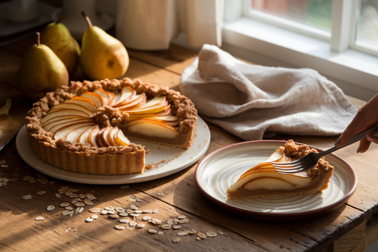 תמיד אהבתי את הרגע הזה שבו מטבח של בית מתמלא ניחוחות פירותיים ורמיזה עדינה של קינמון, זה שהופך כל ערב סתווי לאירוע חגיגי וחם. את הגרסה הזו של טארט אגסים טבעוני פיתחתי אחרי שנים של חיפושים אחר קינוח שגם יכבד את המורשת הצרפתית וגם יתאים לאורחים עם מגבלות תזונתיות. פעם, באירוח גדול עם חברים ומשפחה, החלטתי לנסות טארט אגסים ללא חמאה וביצים. הופתעתי מהסימפוניה של טעמים ומרקמים – חמימות אגסים מקורמלים, שיערות בצק עדינות ושטרויזל פריך שמכניס אלמנט של הפתעה בכל ביס. כאן משתף אתכם לא רק את המתכון אלא גם את כל ה”סודות” הקטנים שצברתי בניסיונות, כדי להבטיח הצלחה אמתית בגזרת הקינוחים הטבעוניים.